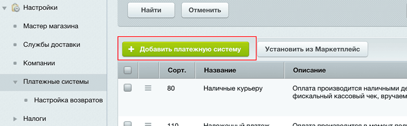 - Войдите в административную панель Webasyst. Выберите Магазин и в правом верхнем углу нажмите Настройки. В боковом меню слева выберите Оплата>Добавить способ оплаты.