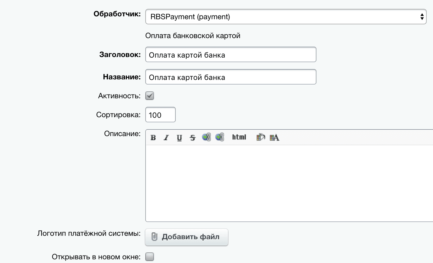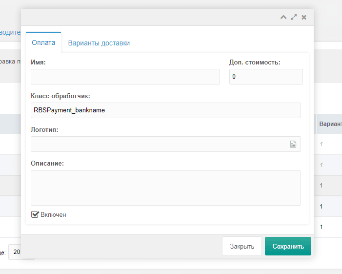 | Название способа оплаты | Укажите название способа оплаты или оставьте значение по умолчанию. |