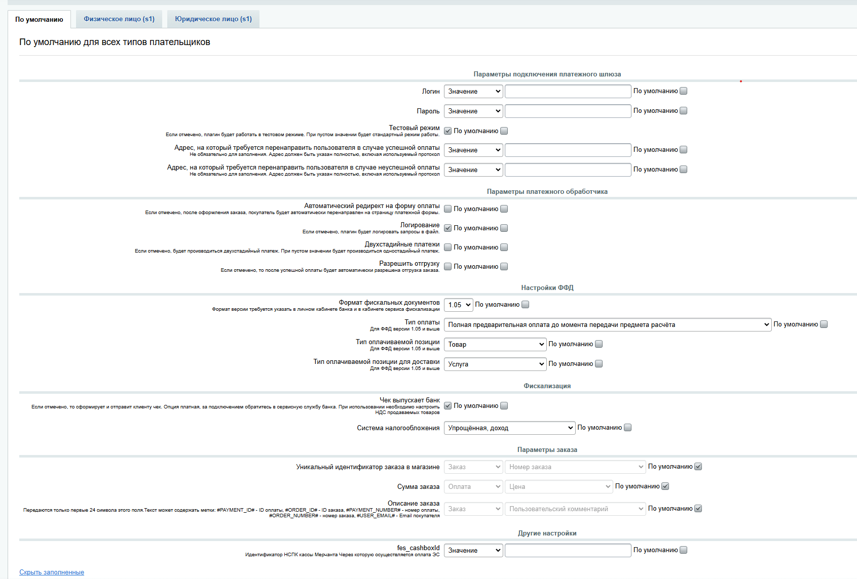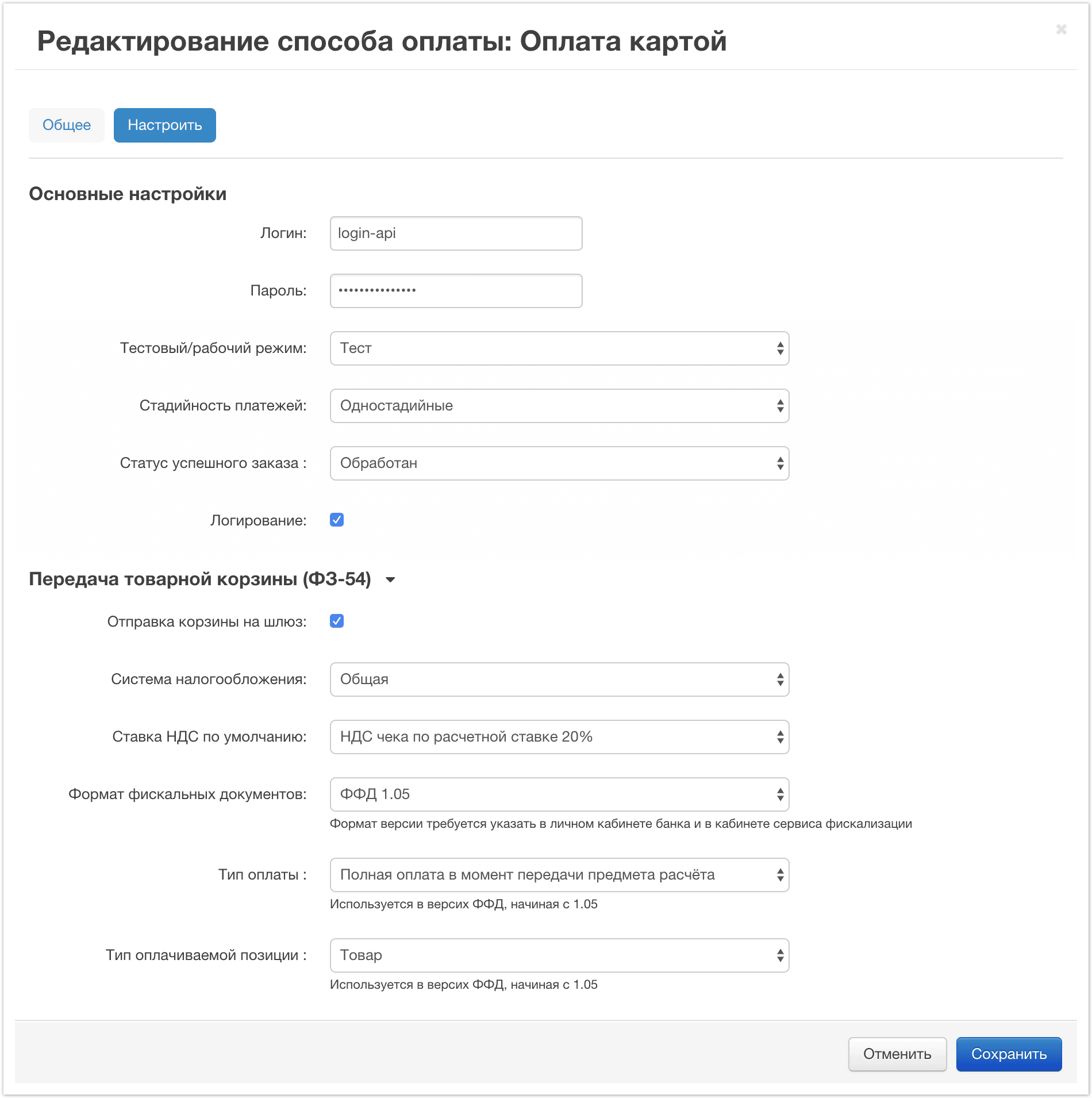 Значения для указанных настроек необходимо заполнить в соответствии с договором эквайринга и вашими бизнес процессами.