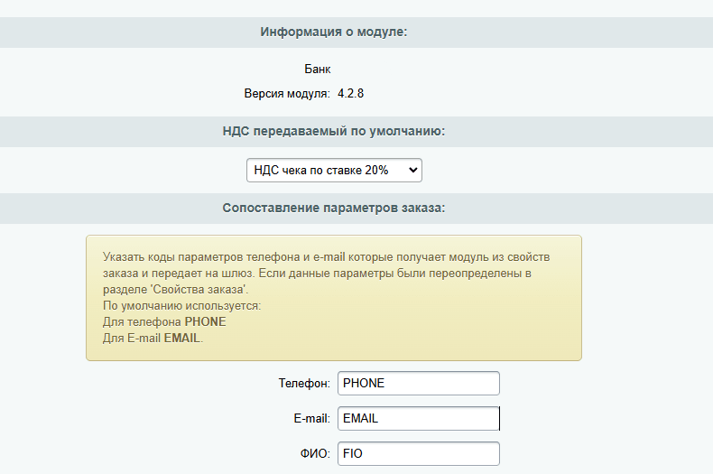 | RBS_VAT_RATE | Налоговая ставка по умолчанию. Возможные значения: