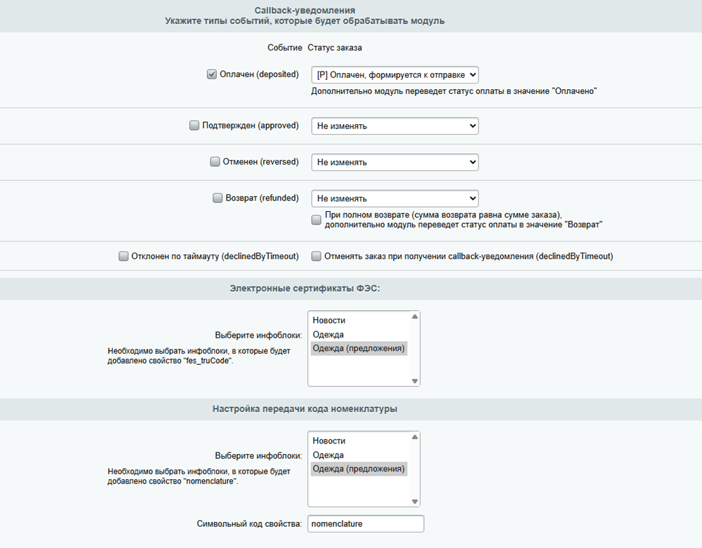 | Статус успешного заказа | Выберите статус в CMS, который будет присвоен оплаченному заказу. |
