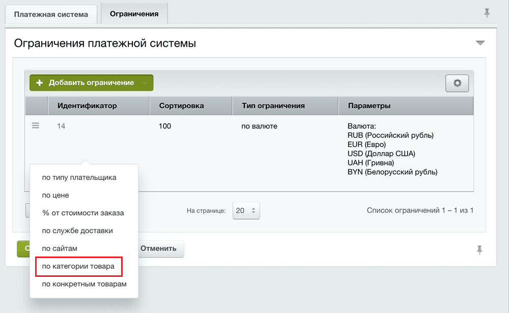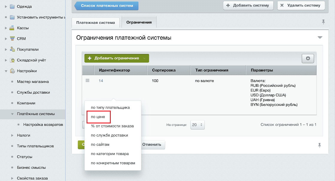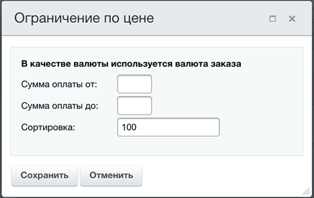 | Доступные методы доставки | Способы доставки, для которых можно использовать данный способ оплаты. |