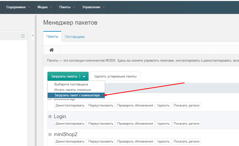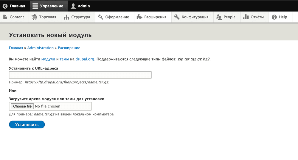 - Перетащите загруженный архив в указанную область экрана (или нажмите Выбрать файл и перейдите к нему в стандартном диалоге выбора файла). Нажмите Загрузить этот модуль.