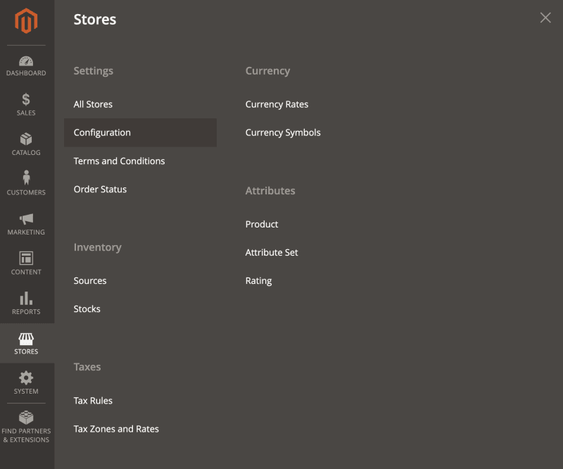 - В меню слева выберите Stores > Configuration (см. рис. ниже).