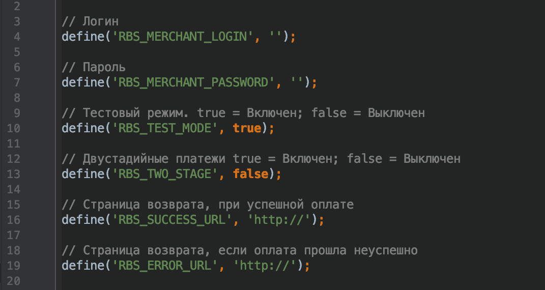 Важно. Чтобы плагин взаимодействовал с платежным шлюзом, укажите URL-адреса платежного шлюза, предоставленные вашим банком, в конфигурационном файле config.php, например: