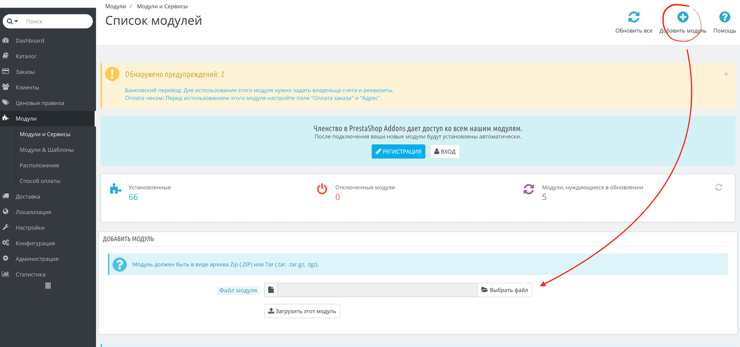 - Войдите в административную панель PrestaShop и в боковом меню выберите Модули > Модули и сервисы.