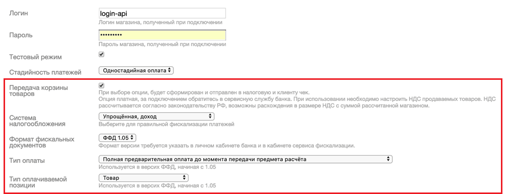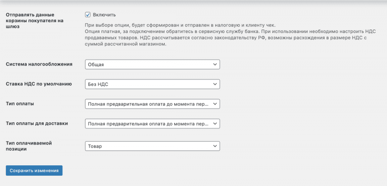 | Передача корзины товаров | Если этот параметр отмечен, чеки по заказам будут создаваться и отправляться вашим клиентам и в налоговую службу. Это платная опция: за подробностями обращайтесь в службу технической поддержки. Обратите внимание, что если вы ее используете, необходимо настроить параметры НДС. |