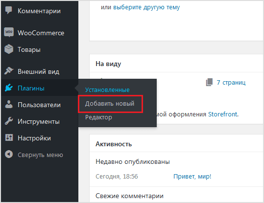 - На левой панели выберите Плагины > Добавить новый (см. рисунок ниже).