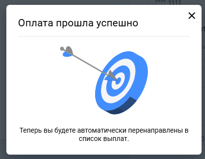 После успешного проведения выплаты отобразится окно с сообщением об успехе операции.