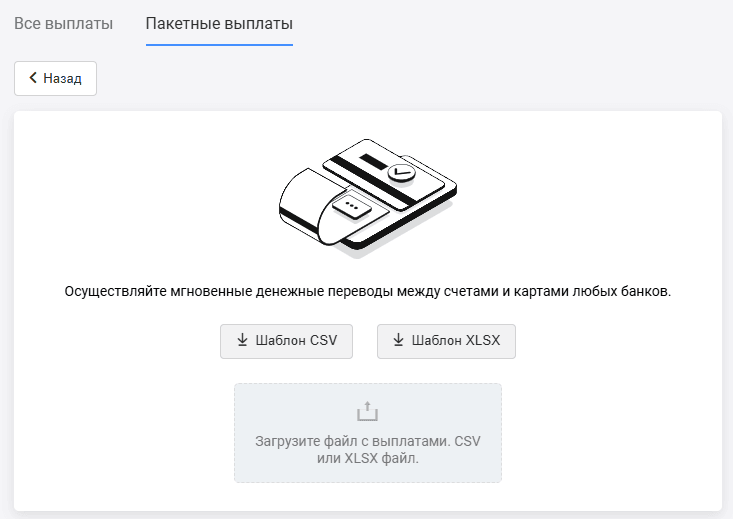 В Личном кабинете поддерживаются пакетные выплаты. Для проведения выплат этим способом Партнер может загрузить в Личный кабинет файл с информацией о выплатах в формате csv или xlsx (реестр), а затем провести выплаты согласно данным в этих файлах. Шаблоны файлов с указанием необходимых полей доступны в Личном кабинете при проведении выплаты.