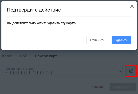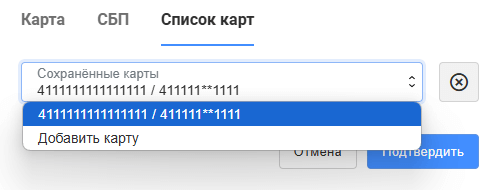 Для проведения выплаты на сохраненную карту необходимо выбрать в списке одну из ранее сохраненных карт.