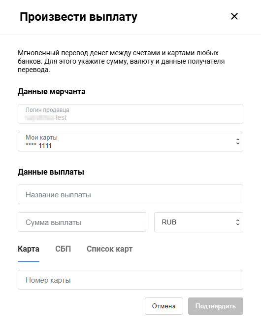 - Поддерживаются выплаты только в валюте с кодом 643 (RUB);