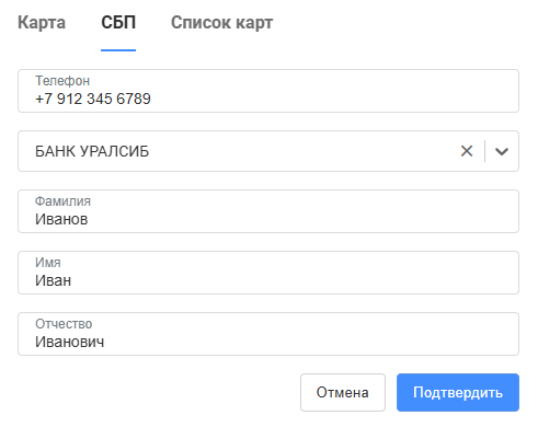 - По номеру телефона через Систему Быстрых Платежей (СБП). Выплаты на СБП возможны только с транзитного счета.