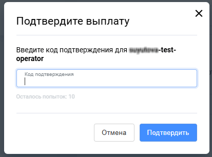 Каждая выплата требует двухфакторной аутентификации, как при входе в Личный кабинет. Поэтому после нажатия на кнопку Подтвердить будет запрошен код подтверждения.